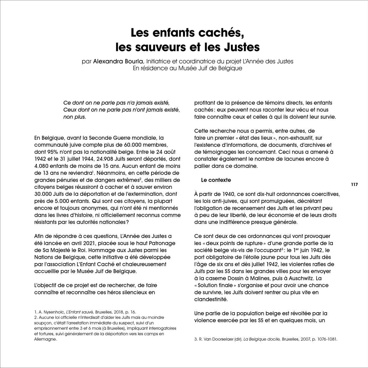 L’Année des Justes (2021-2022) a vu le jour grâce au partenariat entre l’Association l’Enfant caché et le Musée Juif de Belgique. Son but était de faire connaître et reconnaître au niveau national, régional, académique et historique les Justes de Belgique, que ce soit par des évènements, des rencontres, des publications, des croisements d’informations et listes ainsi que des Hommages.